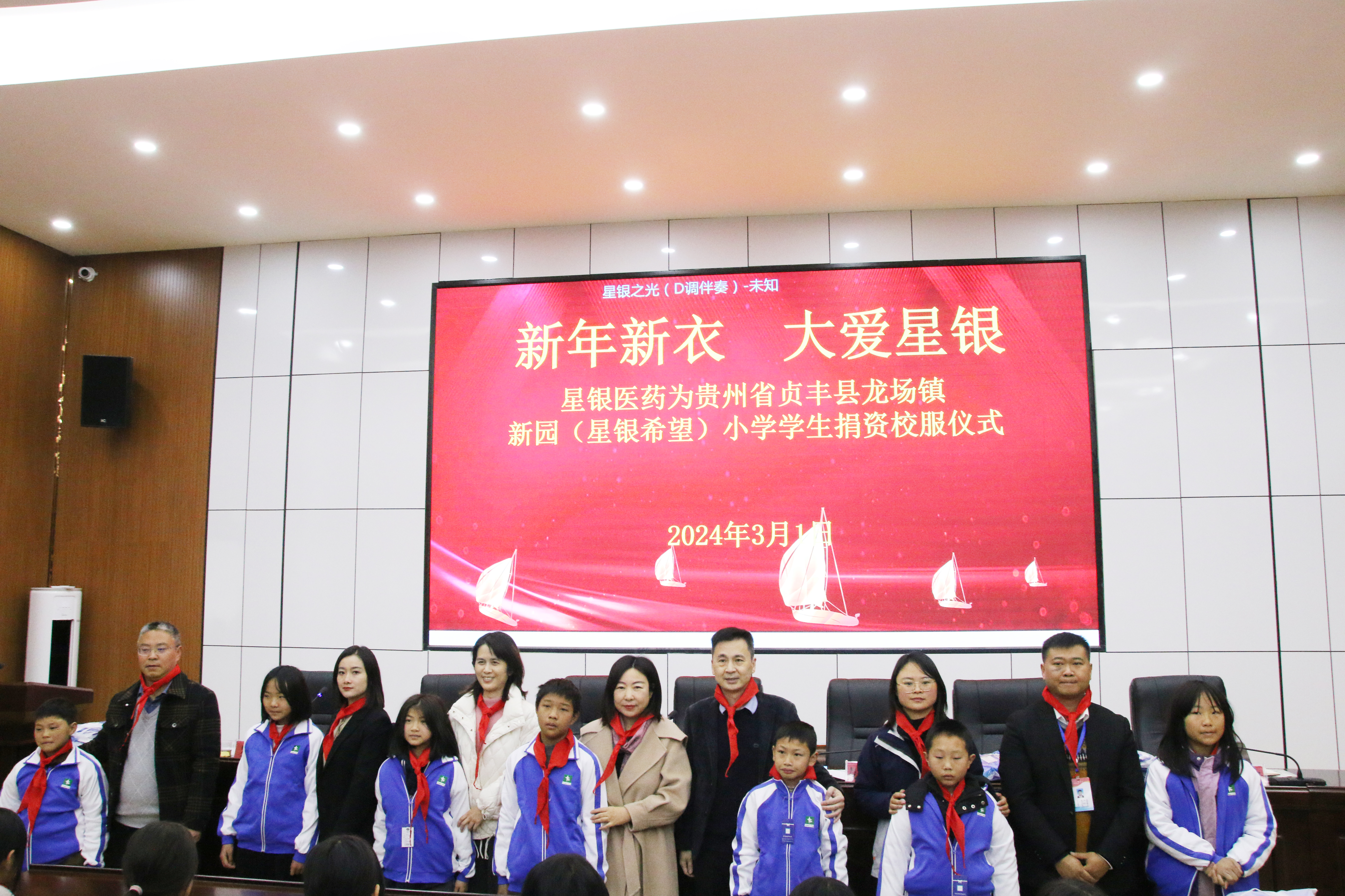 24/06-05春山日暖,萬物萌新。3月1日,新學(xué)期開學(xué)季,深圳市星銀醫(yī)藥有限公司在貴州省貞豐縣龍場鎮(zhèn)新園(星銀希望)小學(xué)舉辦“新年新衣 大愛星銀”校服捐贈儀式。公司領(lǐng)導(dǎo)、星銀醫(yī)藥工會、星銀醫(yī)藥黨支部及貴州辦事處相關(guān)人員參加此次愛心捐贈活動,貴州省貞豐縣龍興街道辦領(lǐng)導(dǎo)、新園小學(xué)全校師生及媒體記者共同見證這溫暖時刻。